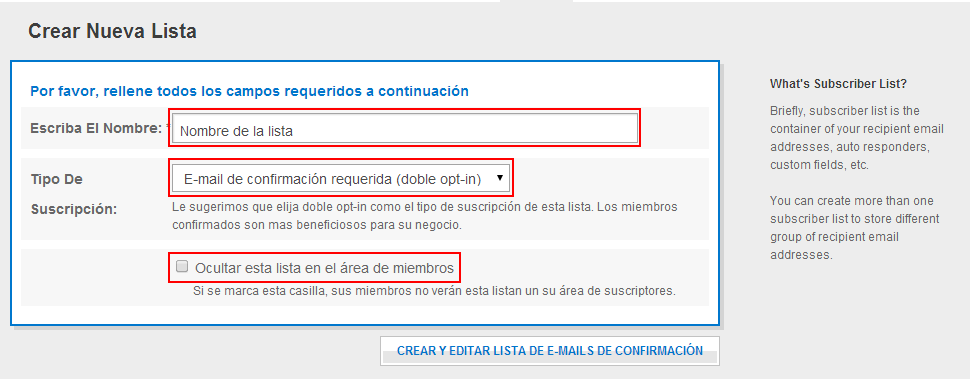 - Tipo de suscripción: si vas a importar miembros que ya tengas almacenados previamente, seleccioná la opción "No se requiere confirmación". En cambio, si vas a usar esta lista para que los miembros se incorporen manualmente desde una página web, seleccioná la opción "E-mail de confirmación requerida".