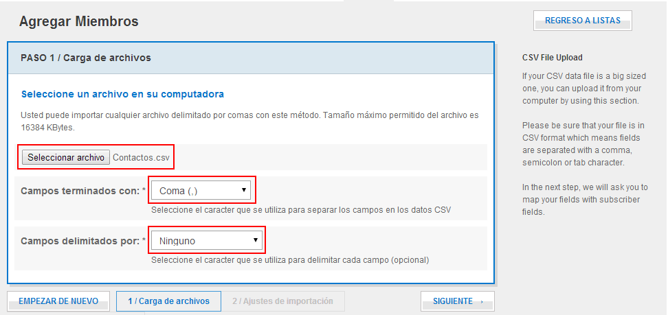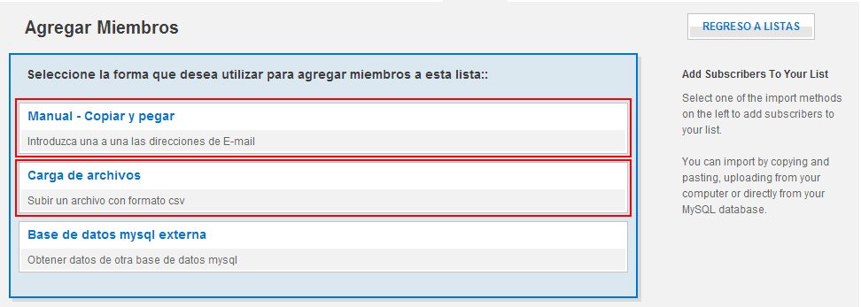 Esta opción es la mas indicada cuando desees importar direcciones de email con otros datos asociados a los miembros como su nombre, empresa, datos personales, etc.