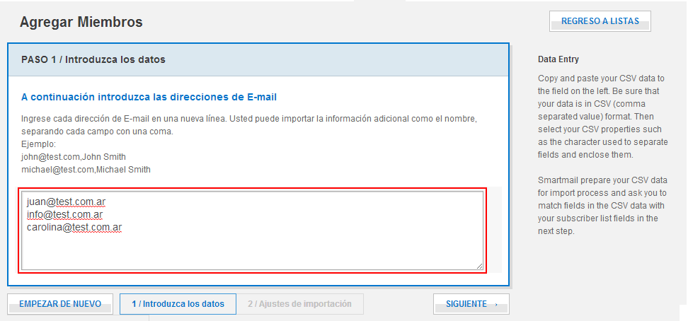 Es el método mas sencillo. Simplemente copiá y pegá todas las direcciones de email (una por línea) en el campo habilitado. Por ejemplo:
