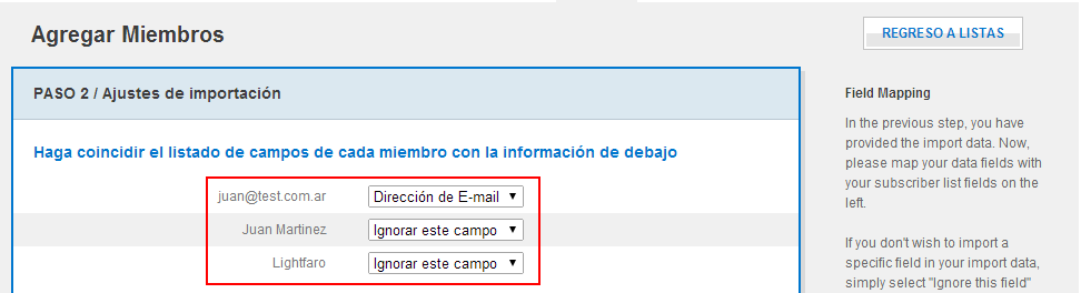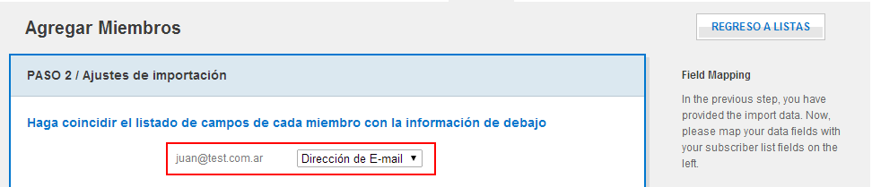 En la instancia próxima aparecerá una de las direcciones de ejemplo y deberás asignarle la opción "Dirección de E-mail". Completá los mismos pasos para importar otros datos de los miembros, como ser nombre y apellido, empresa y/o cualquier otro campo personalizado.