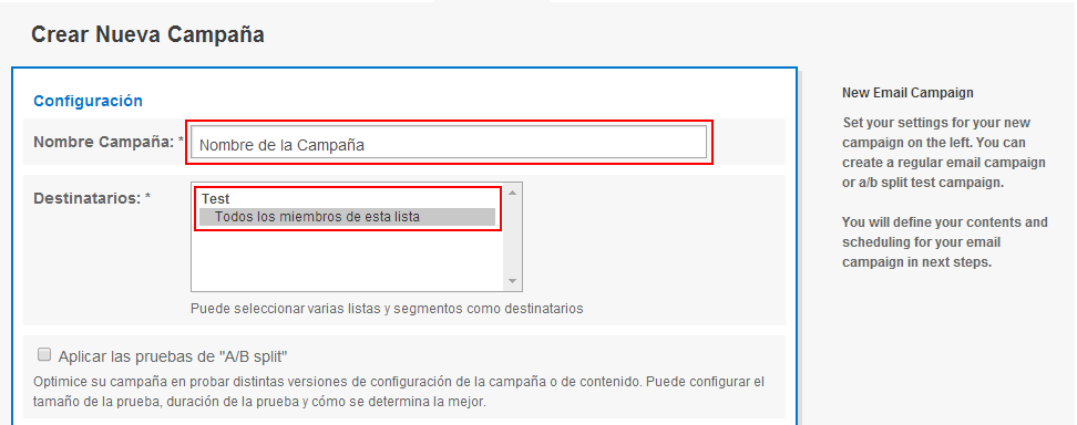 - Destinatarios: aquí deberás seleccionar la/s lista/s creada/s anteriormente y a la/s cual/es querés hacer el envío de la campaña.