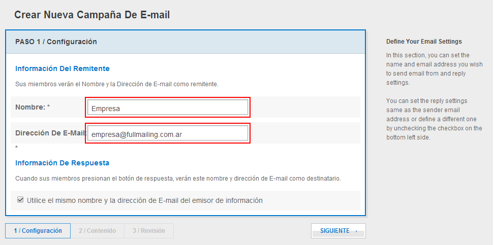 "Utilice el mismo nombre y la dirección de E-mail del emisor de información".