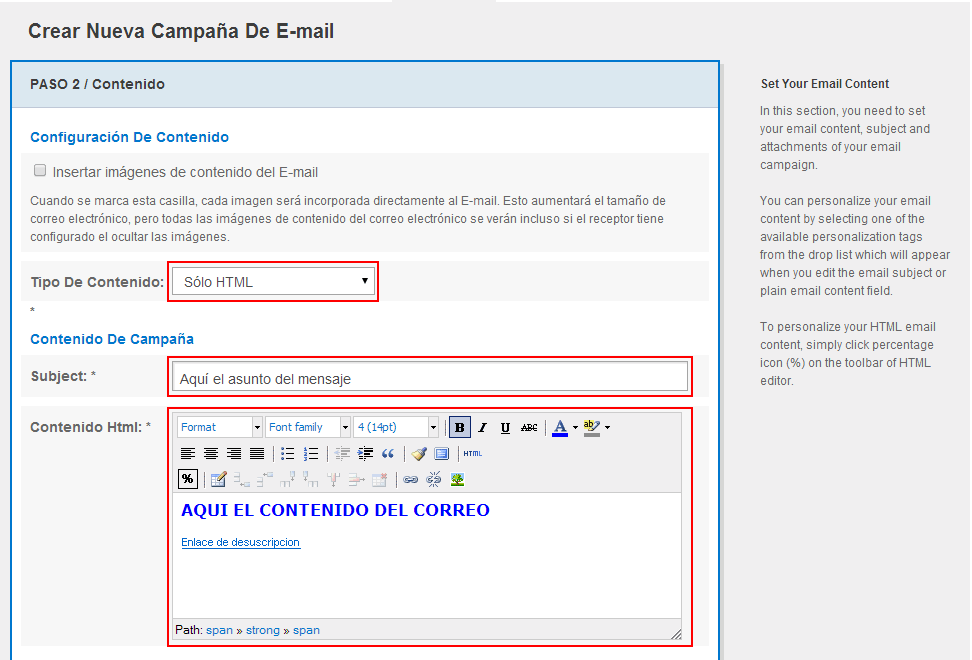 "Subject" deberás indicar el asunto del mensaje. Esta es una parte fundamental de la campaña ya que es lo primero que verán tus contactos para decidir si leen (o no) el contenido. Recordá evitar palabras como gratis, promoción, etc., así como signos de admiración y palabras íntegramente en mayúsculas.