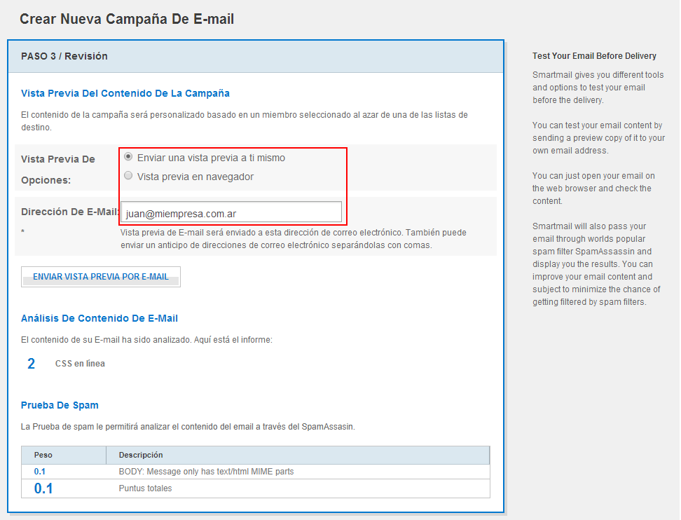 Finalmente podrás enviar una vista previa del mensaje a cualquier email, así como previsualizar el diseño en un navegador para revisar que todo se encuentre en condiciones.