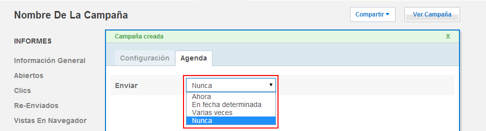 - Nunca: con esta opción podrás dejar guardada la campaña y hacer el envío en otro momento. Para enviar la campaña mas tarde, seleccioná el botón "Campañas" en el menú superior y luego buscá tu campaña accediendo a "Borrador". Acordate de revisar que toda la configuración de la campaña se haya guardado correctamente antes de hacer el envío definitivo.